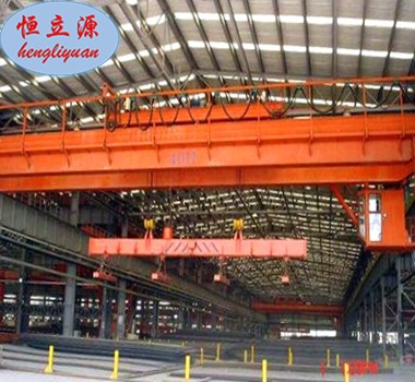 本起重機(jī)帶有掛梁裝置,主要用于鋼廠、船廠、港口、貨場等室內(nèi)或露天的固定跨間,裝卸及搬運(yùn)各種超長的型材物料等